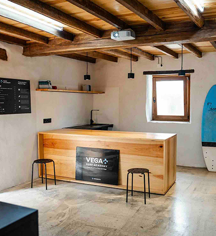 You can find us in our newly renovated barn, located in Vega village. This is where we host our theoretical sessions, video projections, and surf repair workshops. It’s also the perfect place to take a well-deserved hot shower after a long day in the ocean.